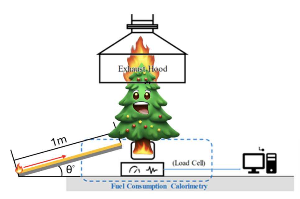 Christmas tree mass loss rate (MLR) will be measured continuously at 1 Hz using a mass balance with a 0.1 g precision. If possible, cone calorimeter measurements will be performed to determine a representative heat of combustion, ΔHc, for each tree. If not, a constant value will be assumed – ΔHc = 17.7 kJ/g [Mell et al. 2009] – and heat release rate will be calculated as: HRR=MLR×∆Hc. |